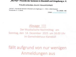 Das Niebüll-Deezbüller Duo Not2Late sorgt mit adventlicher und weihnachtlicher Musik an Gitarre und Bass, kleinen Geschichten und Döntjes für eine festliche Atmosphäre. Die Veranstaltung richtet sich an alle Seniorinnen und Senioren aus Klanxbüll und Umgebung. Der Eintritt ist frei – eine Anmeldung wird bis zum 10.12.2025 telefonisch unter 04668–482 oder per E-Mail an sinkup2018@gmail.com erbeten.