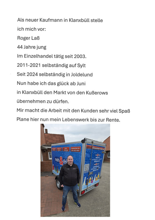 Am Mittwoch schließt unser bisheriger Kaufmann Peter Radke-Kußerow zusammen mit seiner Frau Petra Kußerow nach über 20 Jahren die Türen von Ihrem Geschäft Am Bahnhof 4 ab. Er geht in den wohlverdienten Ruhestand. hier wollen wir unseren neuen zukünftigen Kaufmann Roger Laß vorstellen. Roger Laß stellt sich selbst einmal kurz vor und beschreibt, was sich ändern wird.